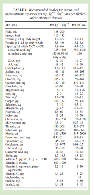 Sources of nutrient recommendations for preterm infants include the American Academy of Pediatrics Committee on nutrition, the European Society of Paediatric Gastroenterology and Nutrition Committee on Nutrition (ESPGAN-CON), National Neonatology Forum (NNF) (6) and the reasonable ranges of nutrient intakes published by Tsang et al (7).