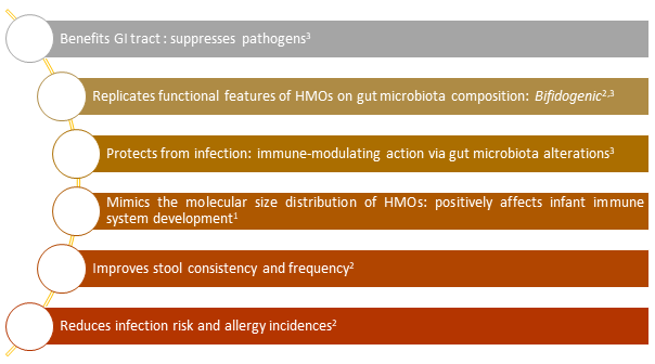 A 9:1 blend of short-chain galacto-oligosaccharides and long-chain fructooligosaccharides (scGOS/lcFOS) has been proven to support immune development by affecting the gut flora. It lowers the incidence and severity of upper respiratory tract infections (URTIs) in healthy infants.1